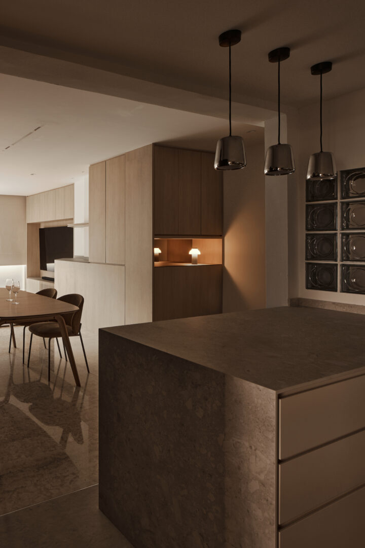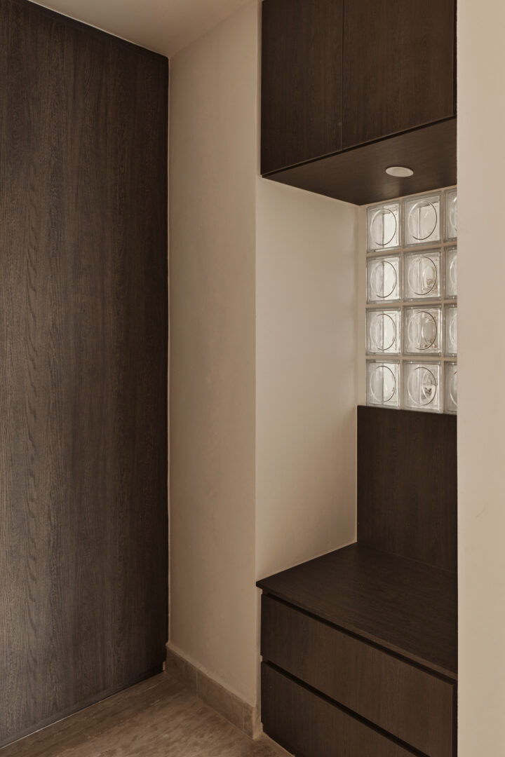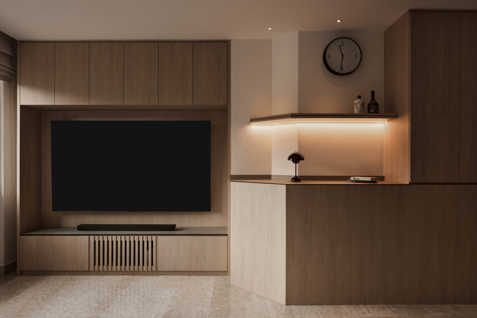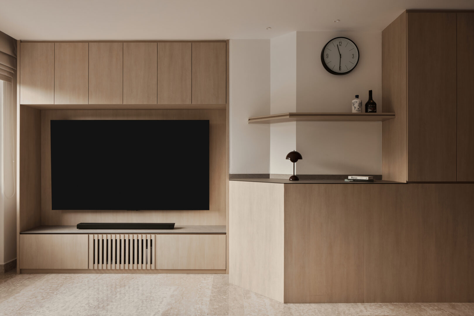 One particular spatial challenge we had was having to work around a large structural concrete block right in the centre of the living area. By integrating much-needed storage and additional counter space with a built-in TV console, the overall structure has now blended seamlessly with the rest of the home.