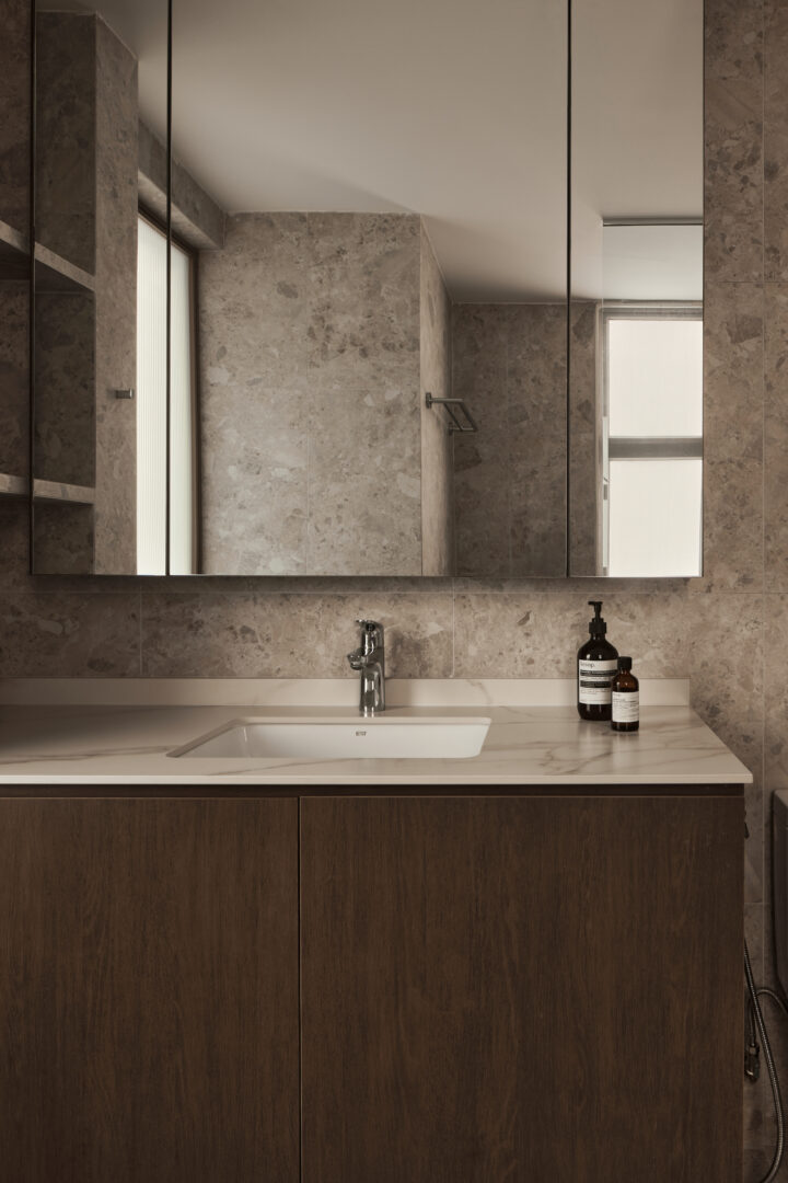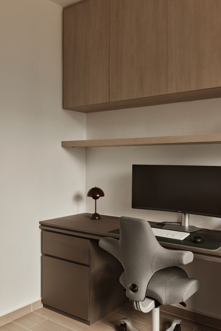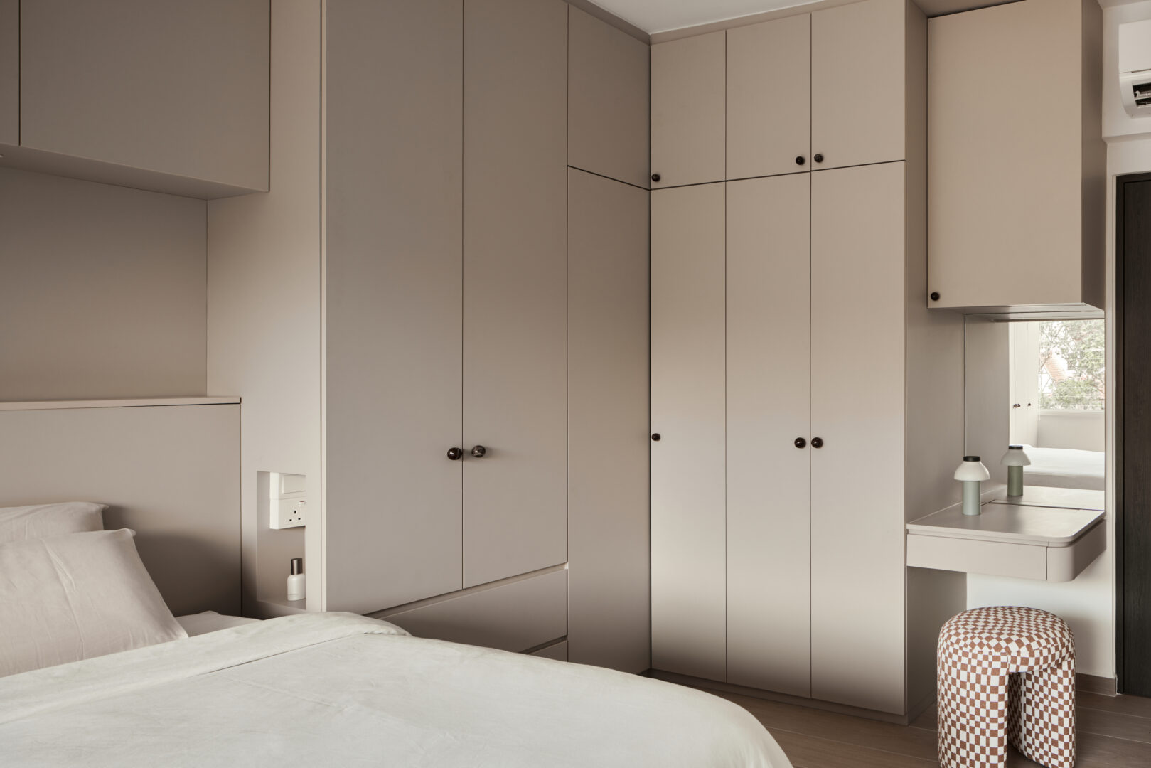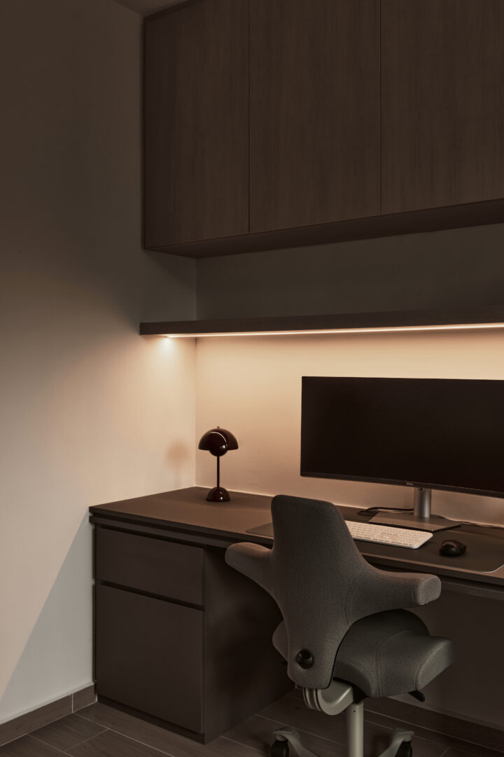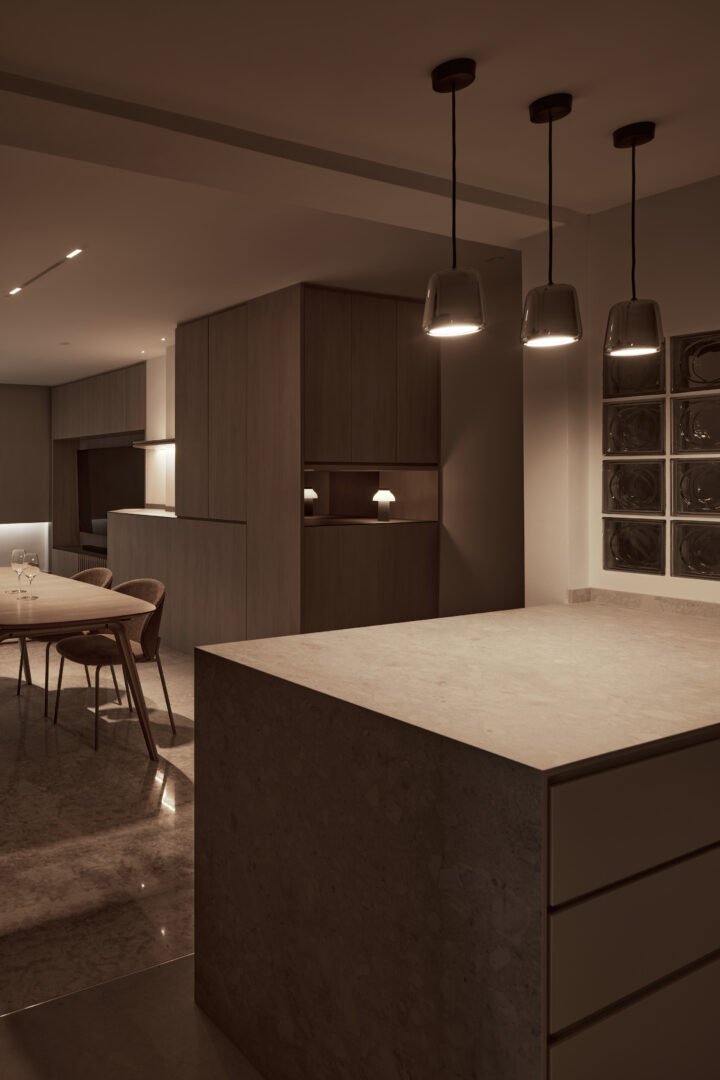 One particular spatial challenge we had was having to work around a large structural concrete block right in the centre of the living area. By integrating much-needed storage and additional counter space with a built-in TV console, the overall structure has now blended seamlessly with the rest of the home.